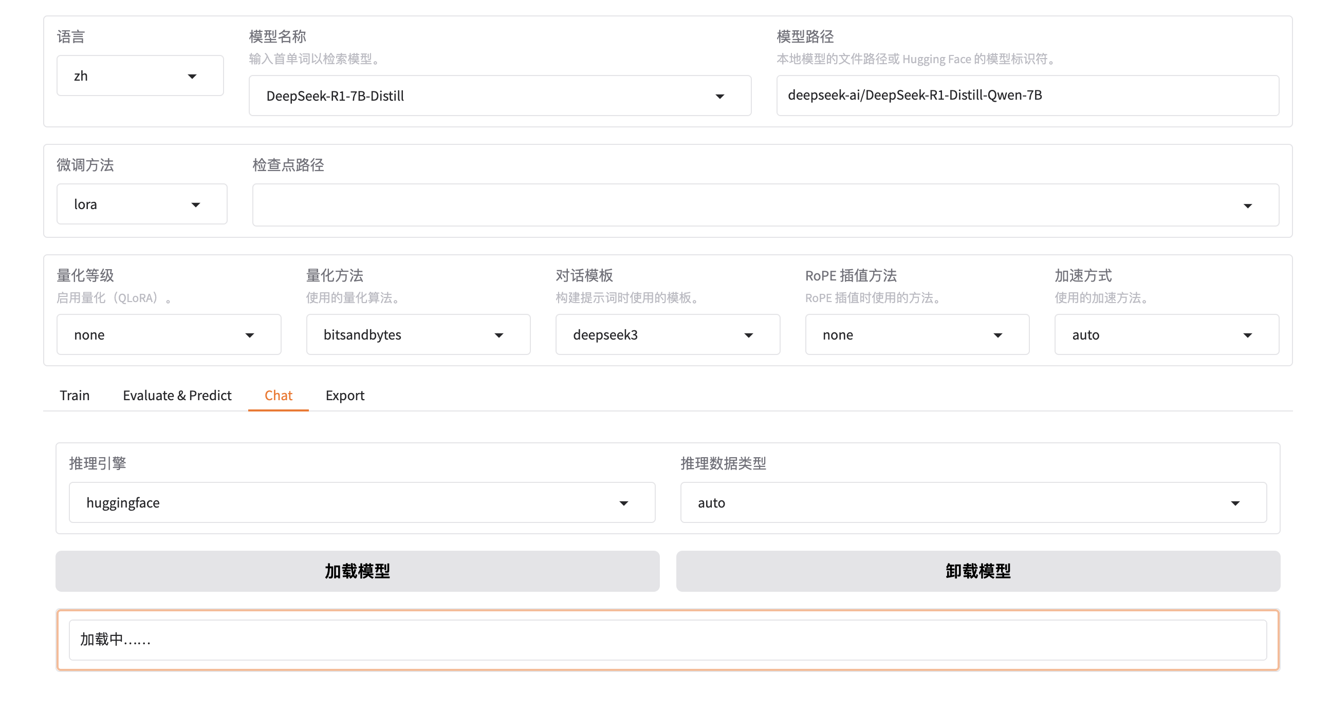 注意使用chat时,需要先选择检查点路径(适配器),然后加载模型,测试完记得卸载模型