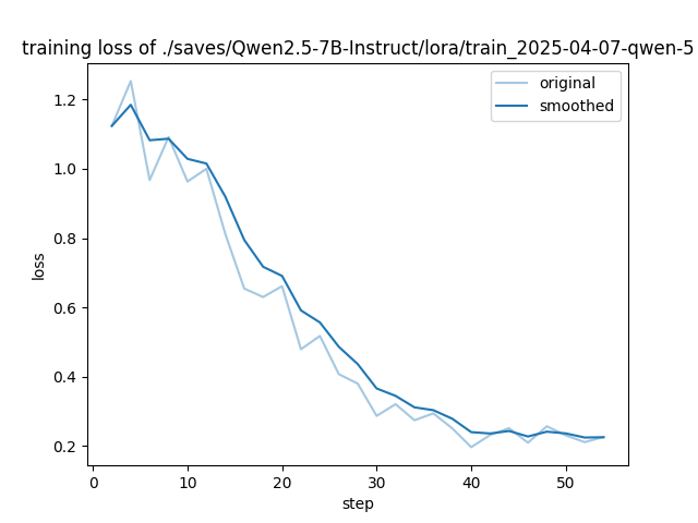 参数 output_dir: ./saves/Qwen2.5-7B-Instruct/lora/train_2025-04-07-qwen-5 目录下有训练后的适配器,训练日志文件和损失函数png