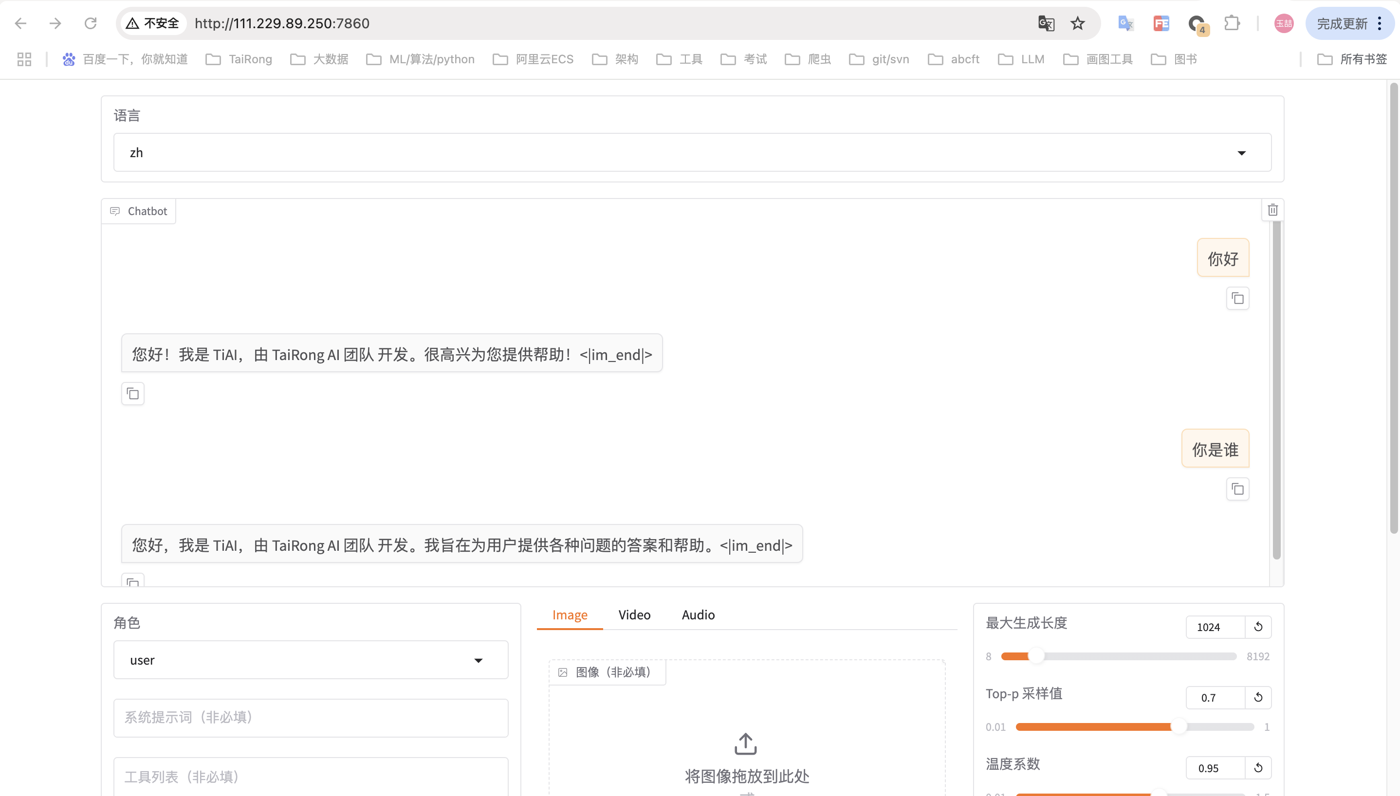 回答中包含 TiAI或者TaiRong AI 团队 表示微调成功了